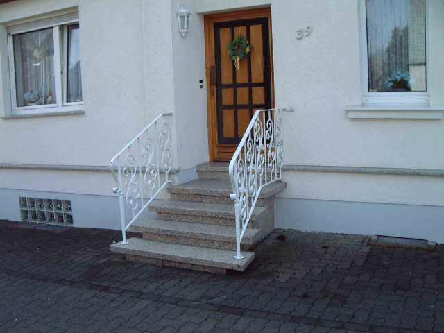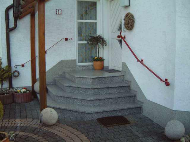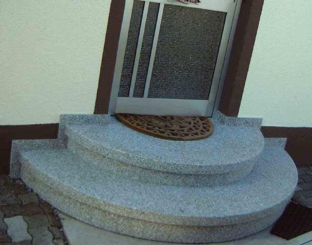 Hier haben wir einen Eingangsbereich geschaffen, indem wir auf einen Betonkern Auf- und Stoßtritte in Bianco-Sardo-Granit verlegt haben. Auch die Seitenwangen wurden in gleichem Material hergestellt.